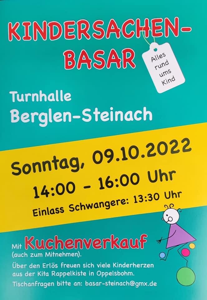 Der nächste Kindersachenbasar in Berglen-Steinach steht an. Er findet am Sonntag, 9.10.2022 von 14.00 Uhr bis 16.00 Uhr statt.