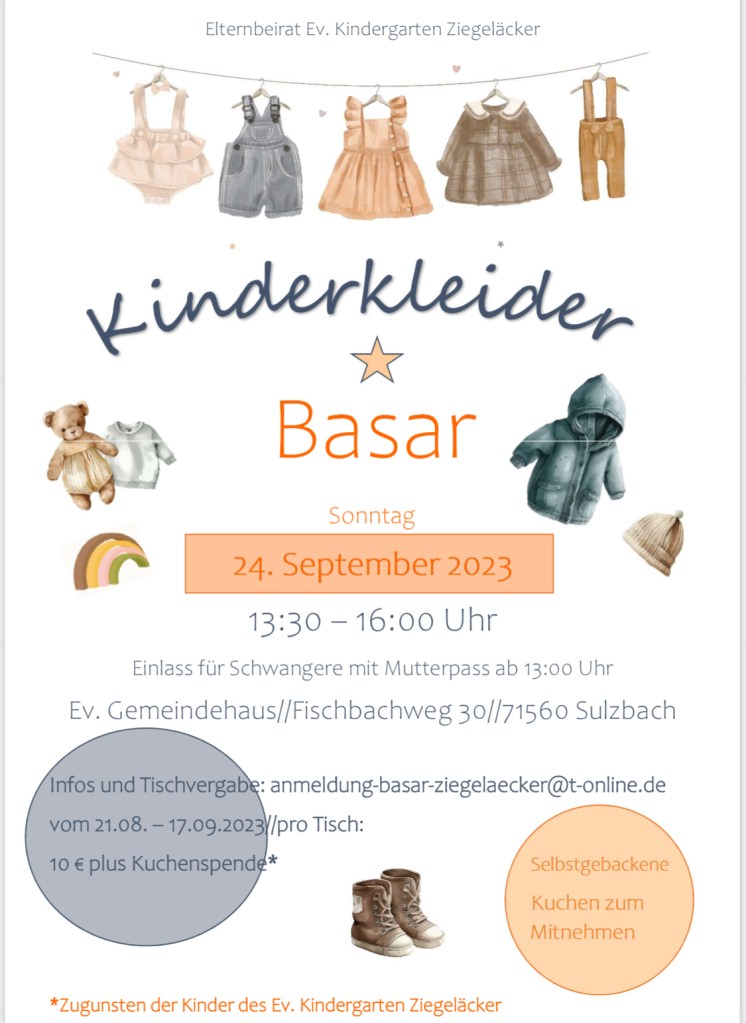 Am Sonntag, 24.09.2023 findet von 13.30 Uhr bis 16.00 Uhr ein Kinderkleiderbasar in Sulzbach statt.