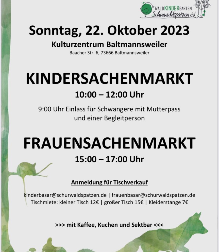 Am Vormittag findet ein Kindersachenmarkt, am Nachmittag ein Frauensachenmarkt statt.