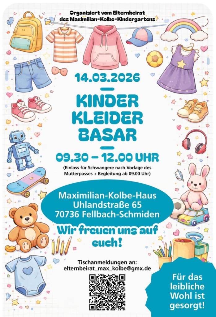 Am Samstag, 14.03.2026 findet in Fellbach-Schmiden ein Kinderkleiderbasar statt.
