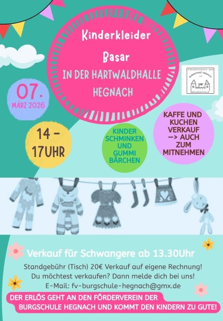 Am Samstag, 07.03.2026 findet in Waiblingen-Hegnach ein Kinderkleiderbasar statt.