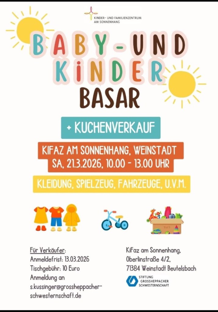 Am Samstag, 21.03.2026 findet im KIFAZ Am Sonnenhang in Beutelsbach ein Baby- und Kinderbasar statt.
