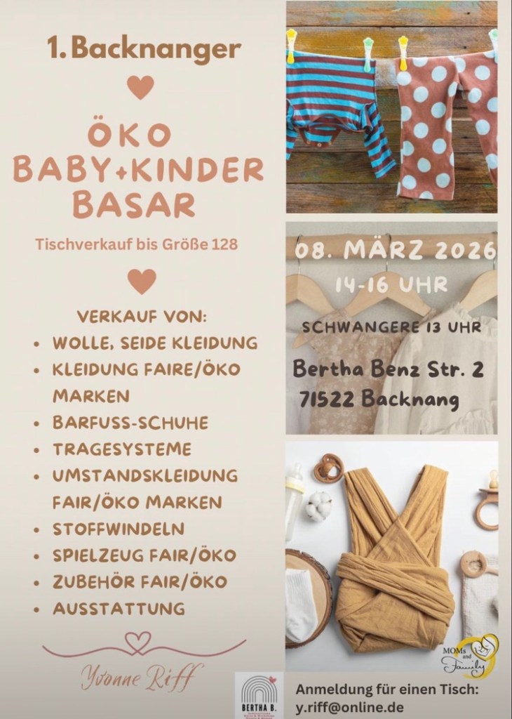 Am Sonntag, 08.03.2026 findet der 1. Backnanger Öko Baby+Kinderbasar statt.