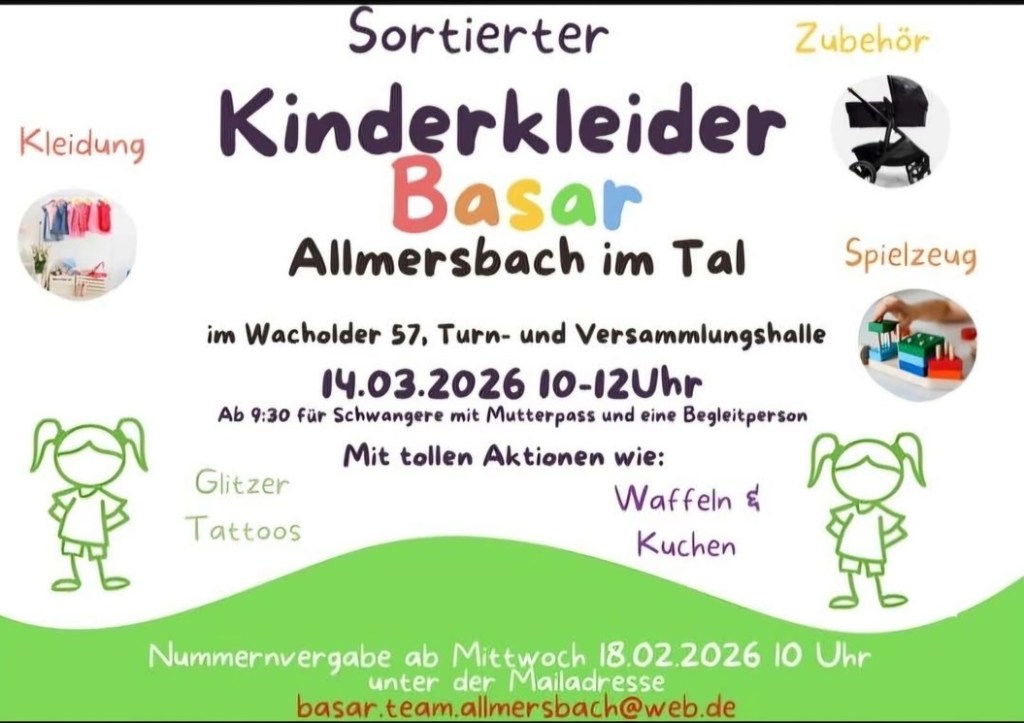 Am Samstag, 14.03.2026 findet der nächste Kinderkleiderbasar in Allmersbach im Tal statt.
