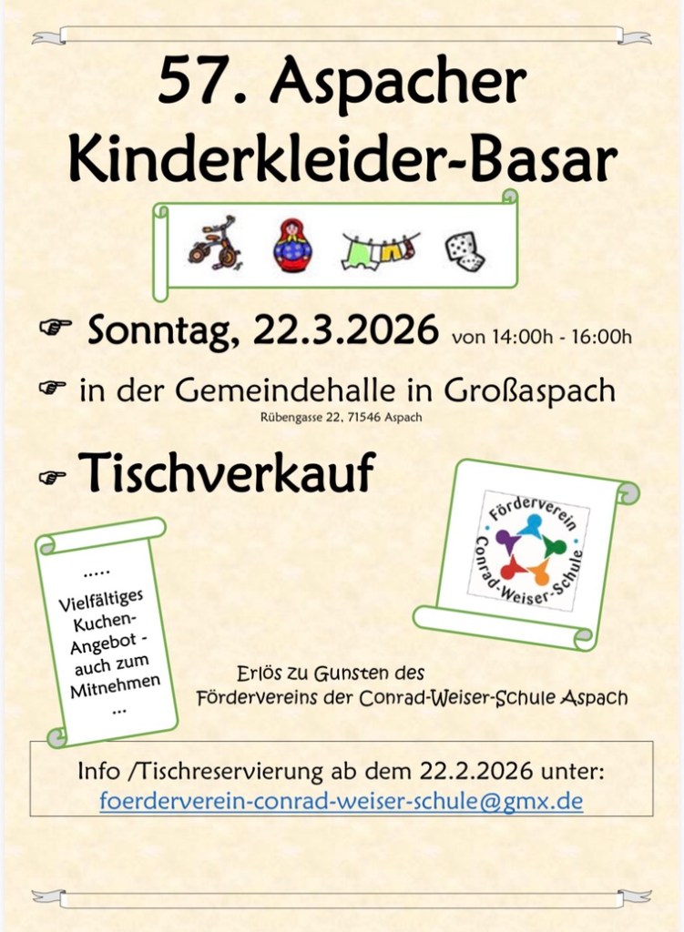 Am Sonntag, 22.03.2026 findet der 57. Aspacher Kinderkleider-Basar statt.