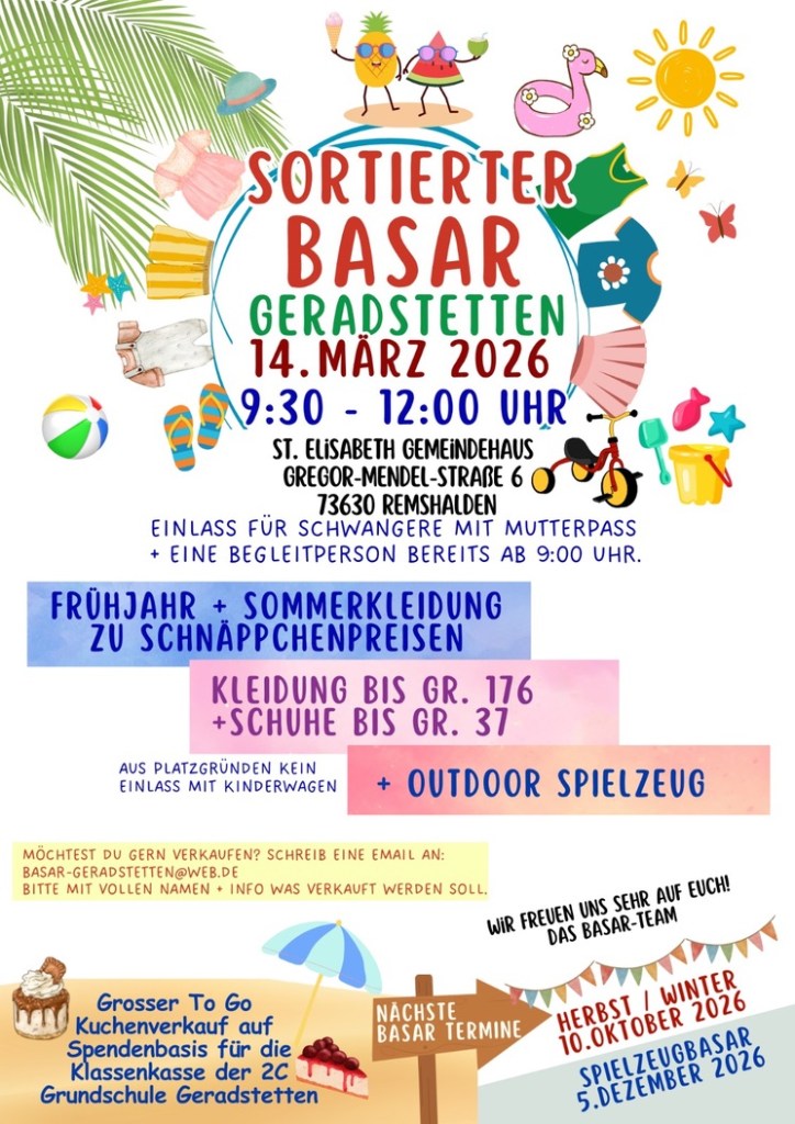Am Samstag, 14.03.2026 findet ein sortierter Kinderbasar in Geradstetten statt.
