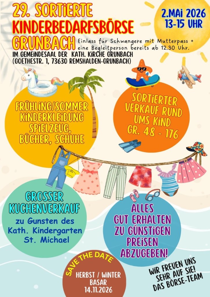 Am Samstag, 02.05.2026 findet von 13.00 Uhr bis 15.00 Uhr die 29. Kinderbedarfsbörse in Remshalden-Grunbach statt.