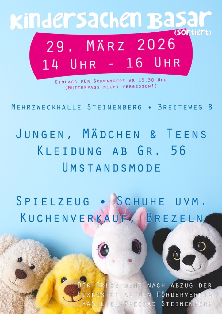 Am Sonntag, 29.03.2026 findet von 14.00 Uhr bis 16.00 Uhr in Rudersberg-Steinenberg ein sortierter Kindersachenbasar statt.