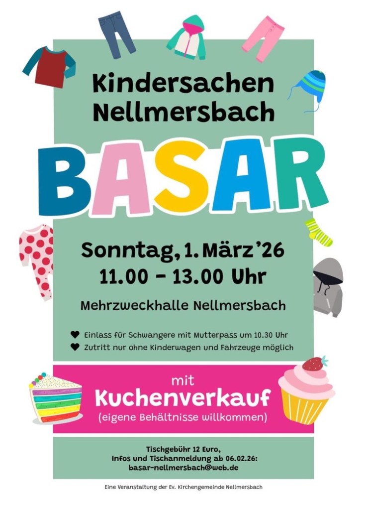 Für Verkäufer: Die Tischgebühr beträgt 12 Euro. Anmeldungen für einen Verkaufsstand sind ab dem 06.02.2026 per E-Mail an basar-nellmersbach@web.de möglich.