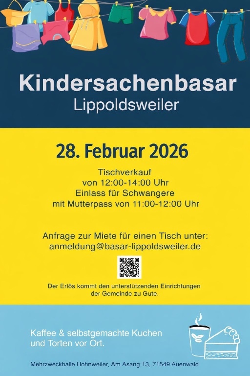 Am Sonntag, 01.03.2026 findet von 11.00 Uhr bis 13.00 Uhr wieder der große Kindersachenbasar in der Mehrzweckhalle Nellmersbach statt.