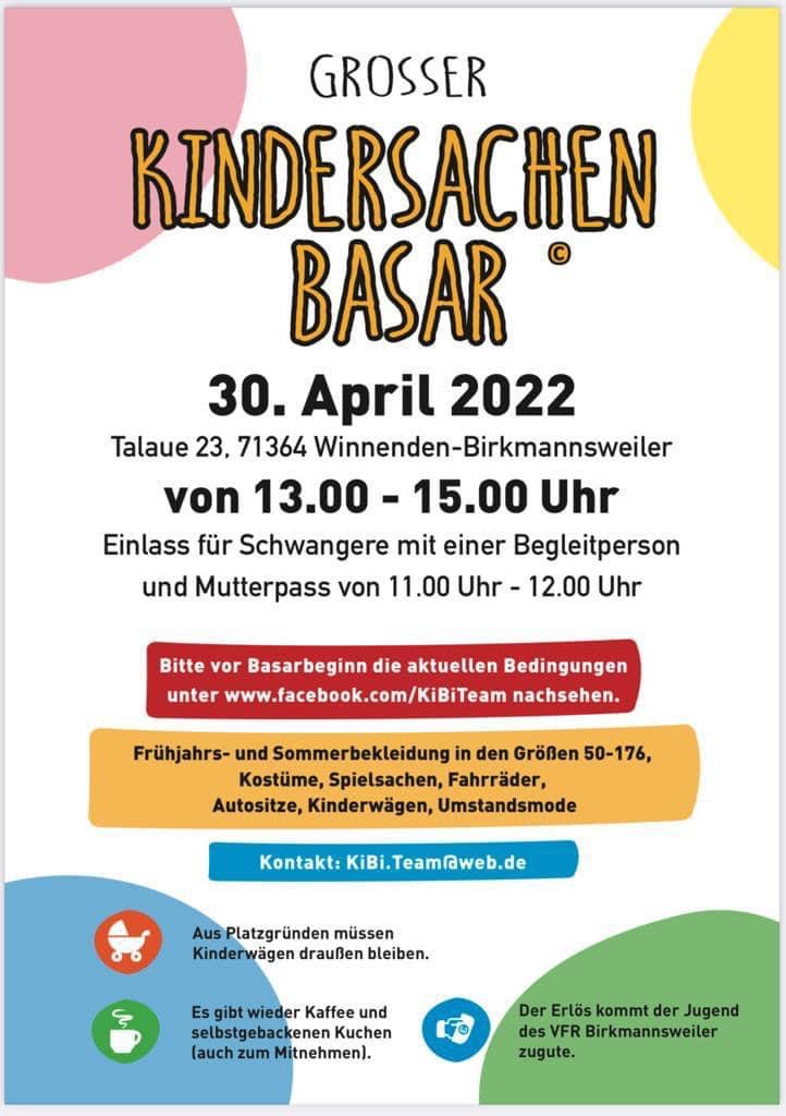 Der Veranstalter hat von der Stadt Winnenden die Information erhalten, dass es zum Basar am 30.04.2022 keine Auflagen geben wird. Die Stadt Winnenden empfiehlt aber ausdrücklich das Tragen einer medizinischen/FFP2-Maske.