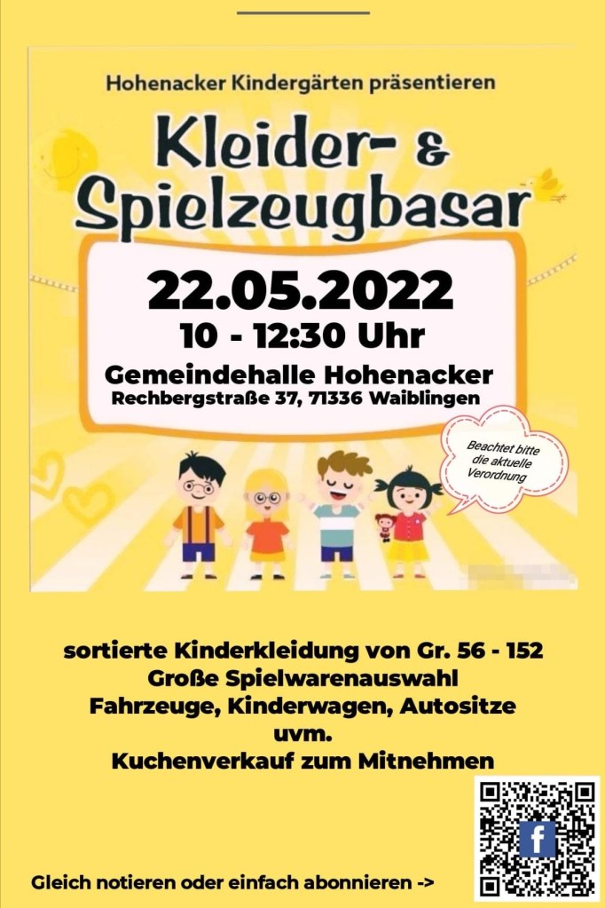 Am 22.05.2022 von 10.00 Uhr bis 12.30 Uhr findet der nächste Kleider- und Spielzeugbasar in Hohenacker statt. Weitere Infos findet Ihr auf dem Foto!