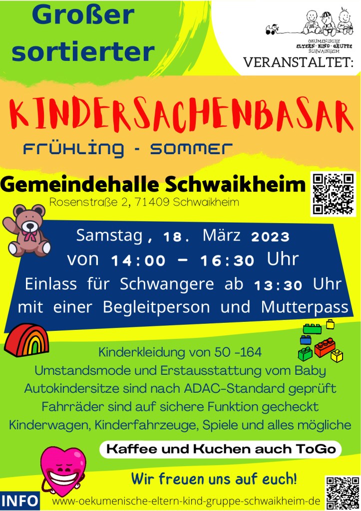 Am Samstag, 18. März 2023 findet wieder ein großer sortierter Kindersachenbasar in Schwaikheim statt.