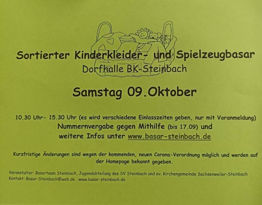 Am Samstag, 11.10.2025 findet in Backnang-Steinbach ein sortierter Kinderkleider- und Spielzeugbasar statt.