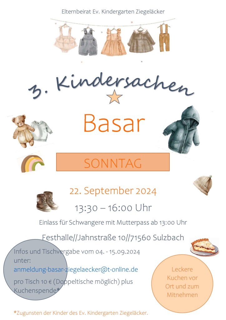 Am Sonntag, 22.09.2024 findet von 13.30 Uhr bis 16.00 Uhr ein Kinderkleiderbasar in Sulzbach statt.