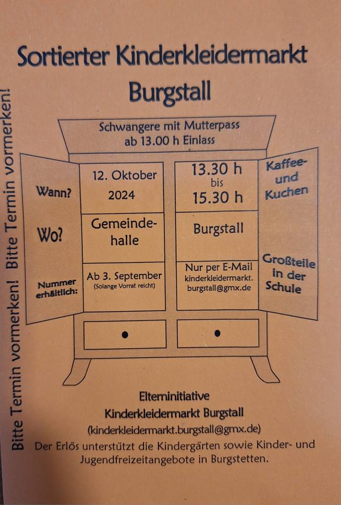 Am 12.10.2024 findet wieder der sortierte Kinderkleidermarkt in Burgstall statt.