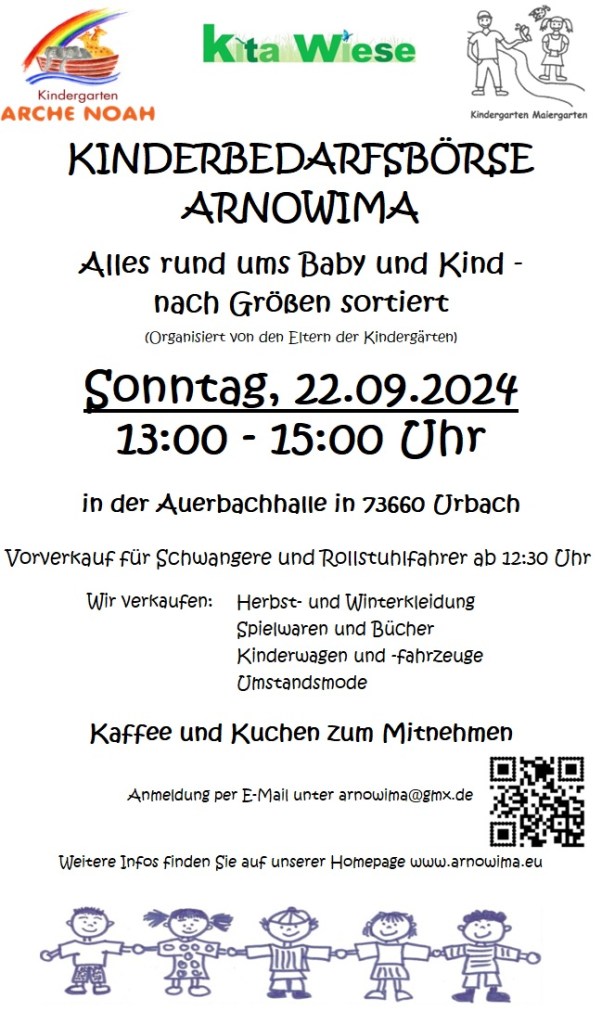 Am Sonntag, 22.09.2024 findet von 13.00 Uhr bis 15.00 Uhr die Kinderbedarfsbörse Arnowima in Urbach statt.