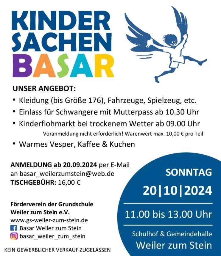 Am Sonntag, 20.10.2024 findet auf dem Schulhof und der Gemeindehalle Weiler zum Stein ein Kindersachenbasar statt.