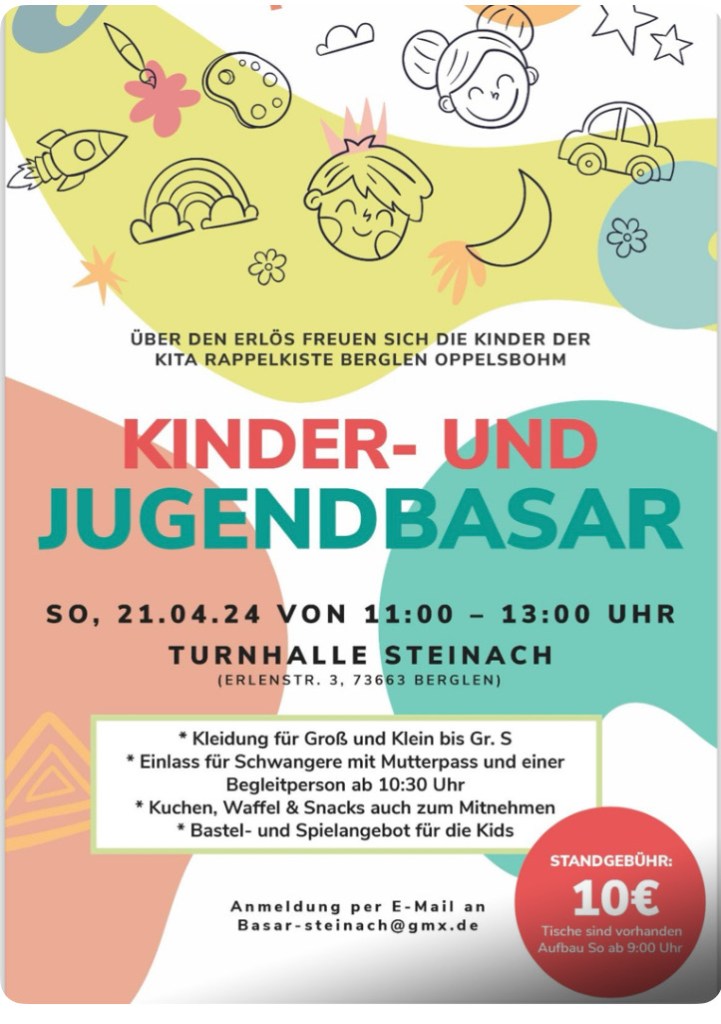 Ein Kinder- und Jugendbasar in Berglen-Steinach steht an. Er findet am Sonntag, 21.04.204 von 11.00 Uhr bis 13.00 Uhr statt.