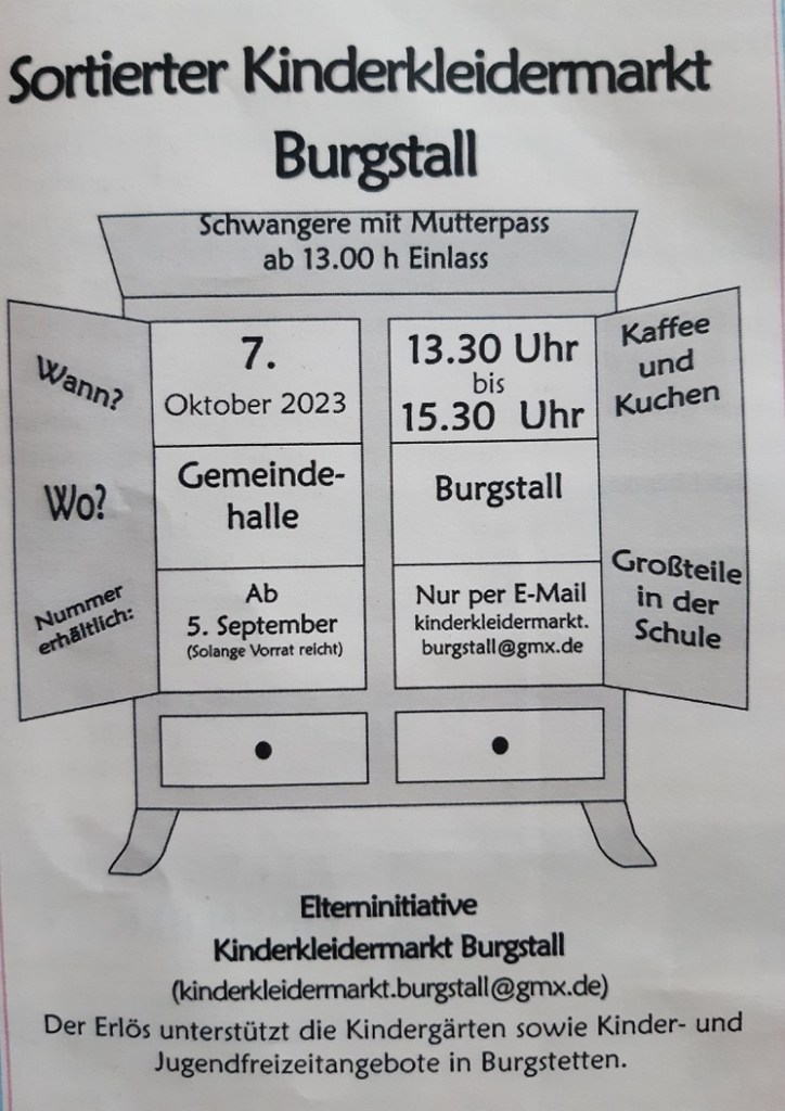 Am 07.10.2023 findet wieder der sortierte Kinderkleidermarkt in Burgstall statt.