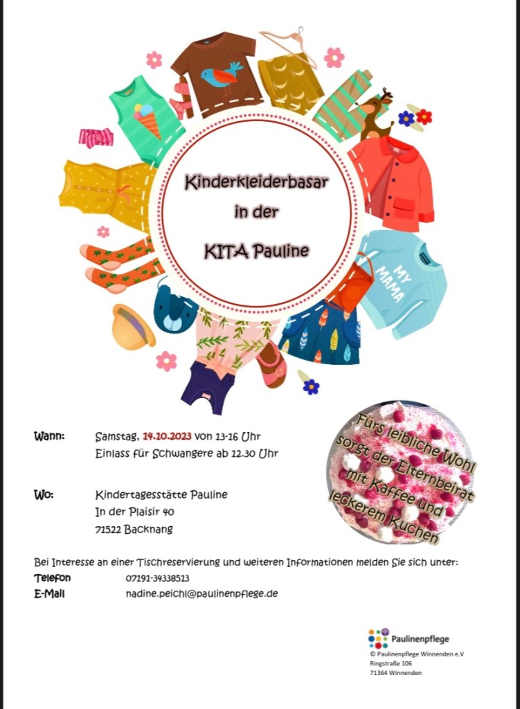 Am Samstag, 14.10.2023 findet von 13.00 Uhr bis 16.00 Uhr ein Kinderkleiderbasar in der Kita Pauline in Backnang statt.