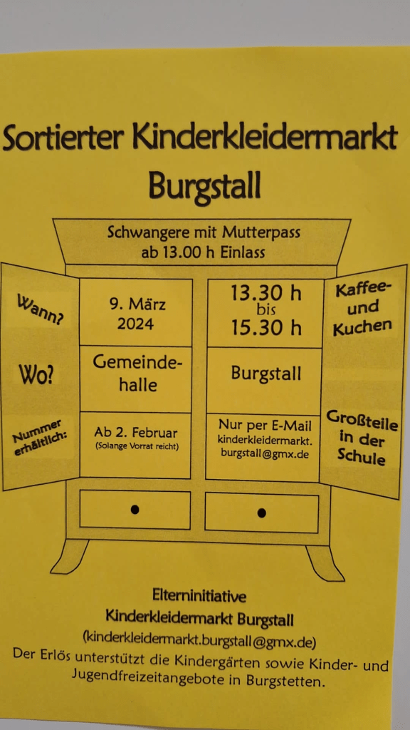 Am 09.03.2024 findet wieder der sortierte Kinderkleidermarkt in Burgstall statt.