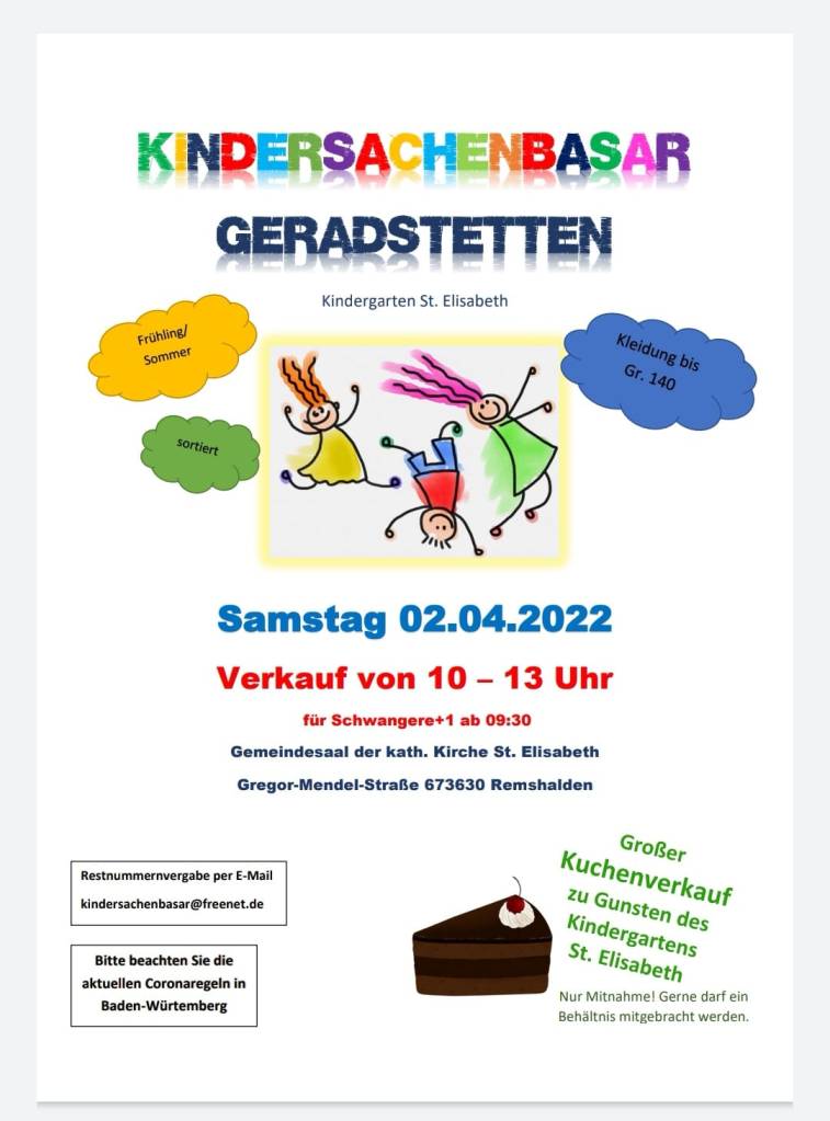 Am Samstag, 02.04.2022 findet der nächste Kindersachenbasar in Geradstetten statt. Alle wichtigen Infos findet Ihr auf dem Foto!