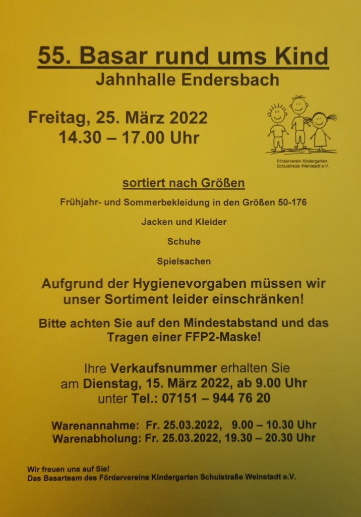 Es ist soweit: der 55. Basar rund ums Kind findet am 25.03.2022 in der Jahnhalle Endersbach statt.